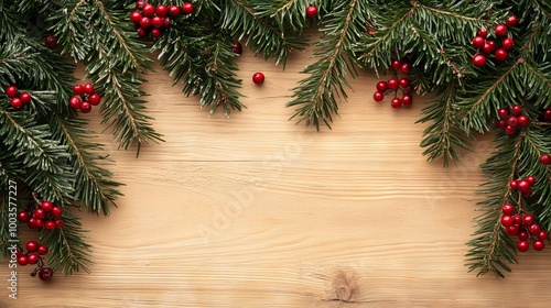 Festive christmas holiday scene with evergreen pine branches and red berries on rustic wooden background, ample copy space for seasonal greetings