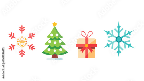 Festive christmas icons featuring snowflakes decorated tree and gift box on a black background