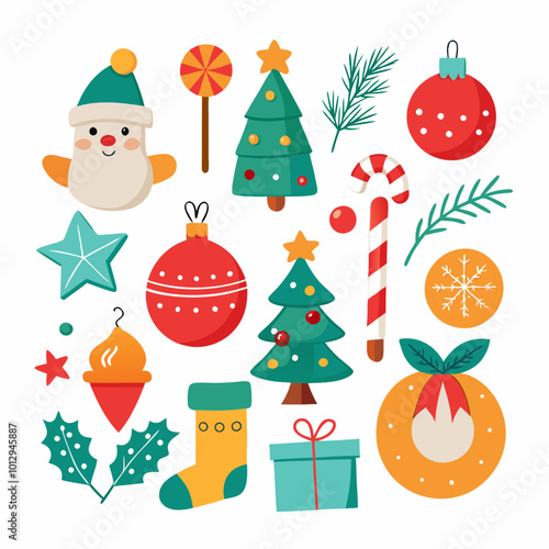 Festive Christmas Scene: Snowman, Santa, Tree, Gifts & Ornaments on White Background"