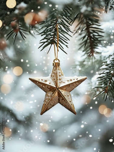 Festive Christmas Scene with Golden Star Ornament - A beautiful golden star ornament hangs on a Christmas tree symbolizing warmth, joy, celebration, tradition, and hope.