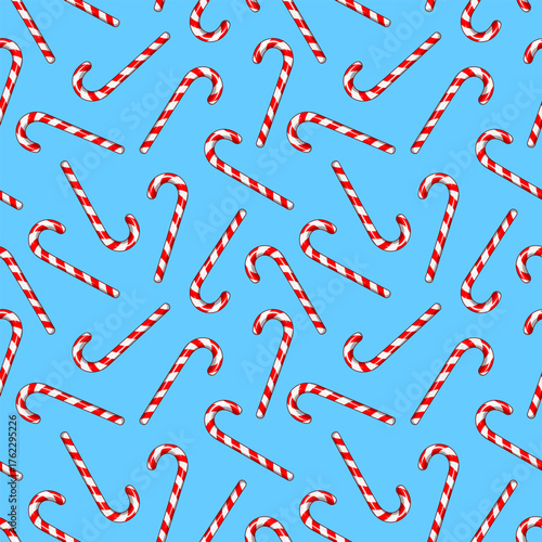 Festive Christmas Seamless Pattern: Playful Red-and-White Candy Canes Scattered on Vibrant Sky Blue Background for Whimsical Holiday Cheer
