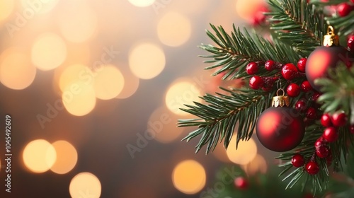 Festive Christmas tree adorned with red berries and golden lights