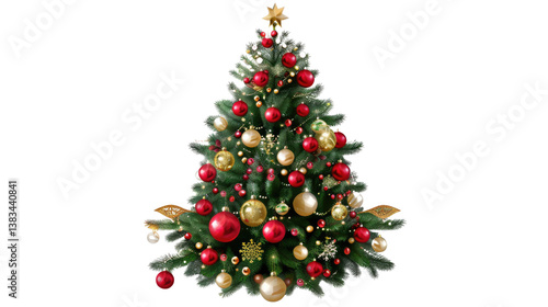 Festive Christmas Tree: An ornamented Christmas tree, sparkling with holiday cheer, decorated with gleaming golden baubles, red ornaments, and a star.