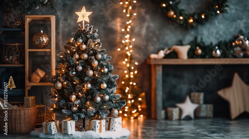 Festive christmas tree display with ornaments and fairy lights in cozy living room setting