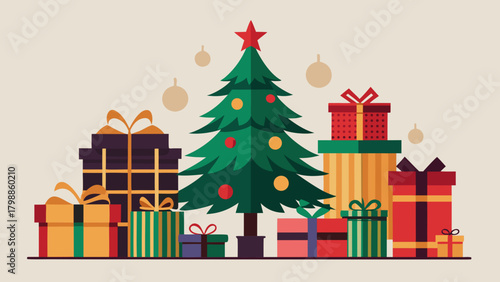 Festive christmas tree surrounded by colorful gift boxes and ornaments