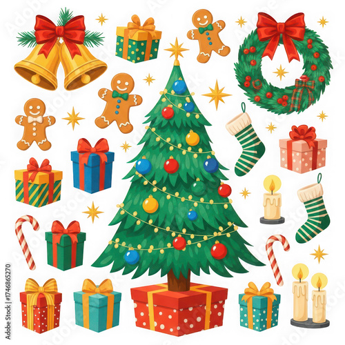 Festive christmas tree surrounded by gifts ornaments bells stockings and gingerbread men holiday design