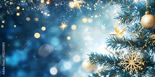 Festive Christmas tree with golden ornaments and sparkling lights against a blue backdrop.