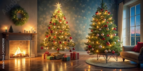Festive Christmas tree with twinkling lights and ornaments in a living room, festive