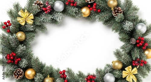 Festive Christmas Wreath with Red Berries and Golden Decorations on a White Background