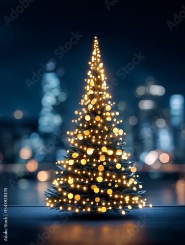 Festive Cityscape Christmas Tree - A glowing Christmas tree stands out against a blurred city night background, symbolizing hope, joy, peace, celebration, and the spirit of the season