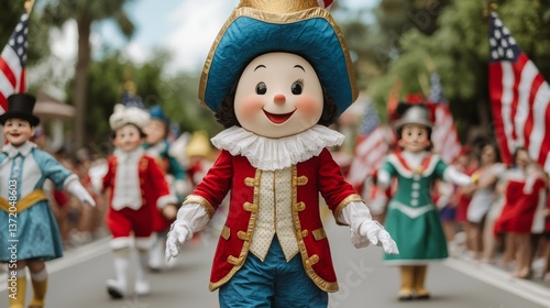 Festive Colonial Mascot Parade in City Center Celebration Colorful Atmosphere Joyful Viewpoint Community Spirit
