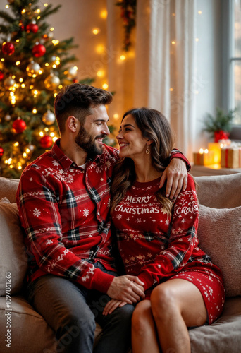 Festive couple on a cozy sofa with a glowing tree, sharing love and holiday cheer.