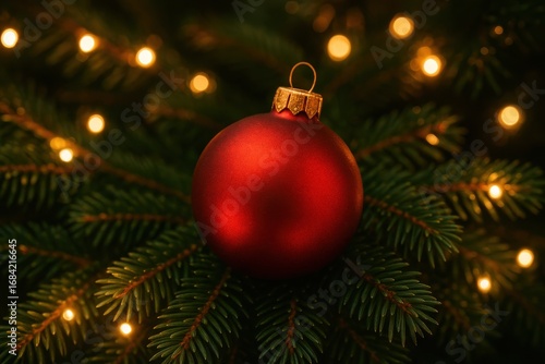 Festive Decoration: A close-up of a red Christmas ornament glistening amidst the vibrant green needles and soft lights of a Christmas tree, capturing the spirit of the holiday season.