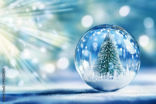 Festive empty glass transparent ball with Christmas tree inside on it. Blue background with white snowflakes and rays of light. Copy space