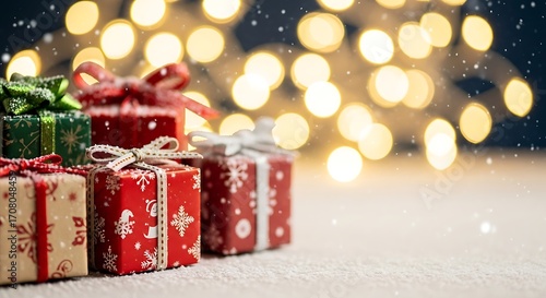 Festive gift boxes with colorful ribbons and bokeh lights create a warm and inviting christmas atmosphere, perfect for holiday greetings and celebrations