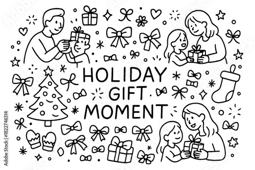 Festive Gift Scene. Holiday gift moment. Hand-drawn doodle illustration of Holiday gift moment. parents,