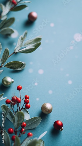 Festive greenery and ornaments on blue background for holiday decor and Christmas mood