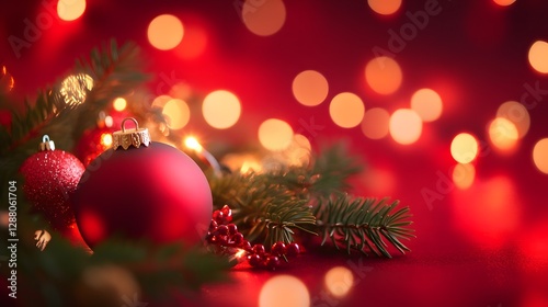 Festive holiday decorations, vibrant red background with glowing lights, ornaments sparkling, perfect for seasonal greetings.