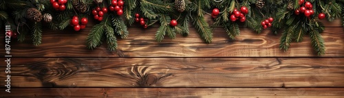 Festive holiday garland with pinecones, red berries, and greenery decorating a wooden background. Rustic Christmas decor perfect for seasonal celebrations.
