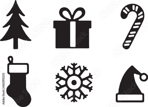 Festive holiday icons: tree, gift, candy cane, stocking, snowflake, hat