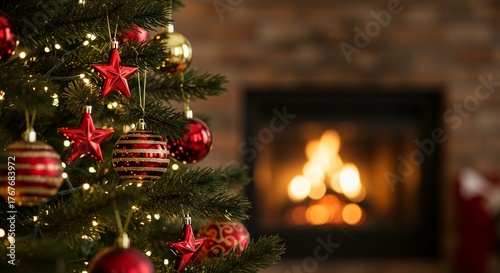Festive holiday tree adorned with red and gold ornaments in front of a warm brick fireplace adding cozy charm.