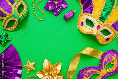 Festive Mardi Gras Top View Layout with Glossy Ornaments, Golden Beads, Feathers, and Luxurious Color Palette