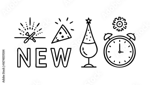 Festive New Year Celebration Icons fireworks clock