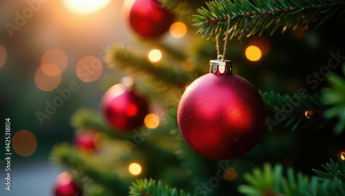 Festive outdoor tree; red ball ornaments, blurry fairy lights , blurred, season