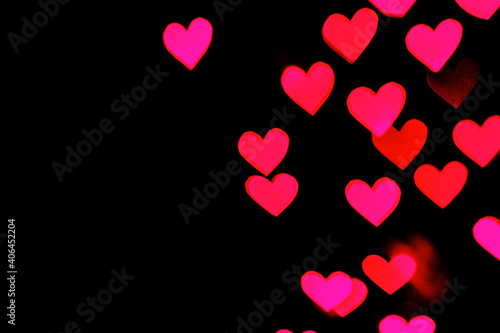 Festive overlay effect. Blurred red and dark pink heart bokeh festive glitter background. Christmas, New Year and Valentine's day design with copy space