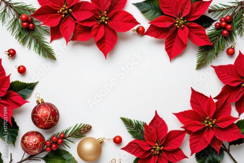 Festive Poinsettia Flowers with Ornaments and Greenery on White Background