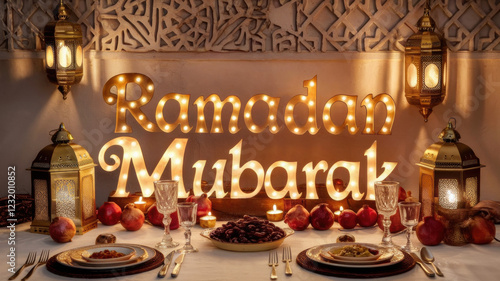 Festive Ramadan celebration with illuminated decorations and traditional dishes in a beautifully arranged setting