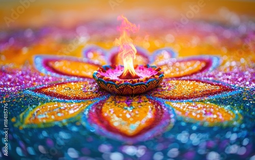 Festive rangoli with radiant mandala patterns, standing out against a dazzling multicolored backdrop
