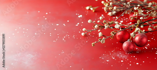Festive red background with winter branches and ornaments. Ideal for Christmas or winter holiday greeting cards