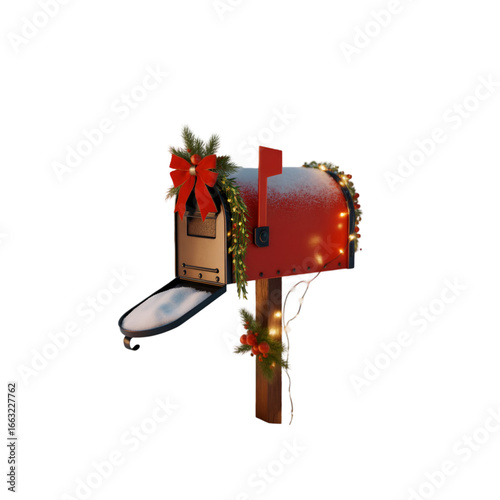 Festive red mailbox decorated for Christmas with snow