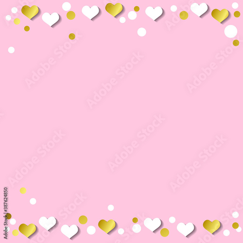 Festive romantic pink background with frame of white hearts and confetti and golden stripes