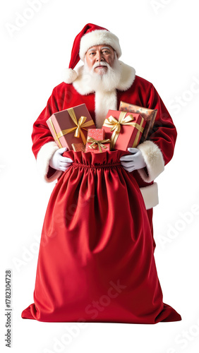 Festive Santa Claus holding large red sack filled with colorful gifts, embodying spirit of giving and joy during holiday season