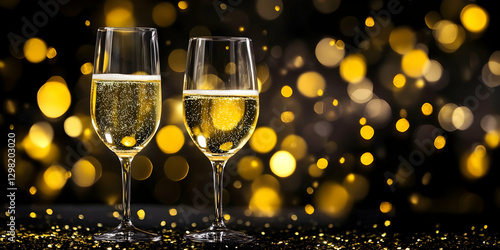 Festive Sparkling Wine Glasses, Gold Bokeh Background