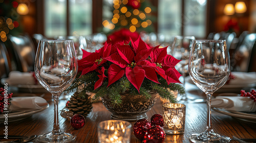Festive Table Setting: A centerpiece of vibrant red poinsettias adds a touch of holiday cheer to a beautifully set table, complete with sparkling wine glasses and warm candlelight.