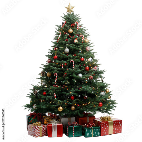 Festive Tree Joy, ornamented Christmas tree with colorful baubles, candy canes, star topper, surrounded by wrapped presents on a transparent background.