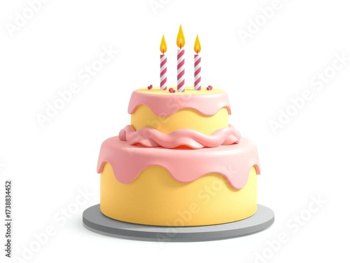 Festive two tier yellow cake with pink frosting and birthday candles