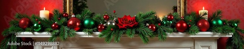 Festively adorned mantelpiece with green and red ornaments and garland, Berry Wreaths, Rose Garland, Mantle Decorating