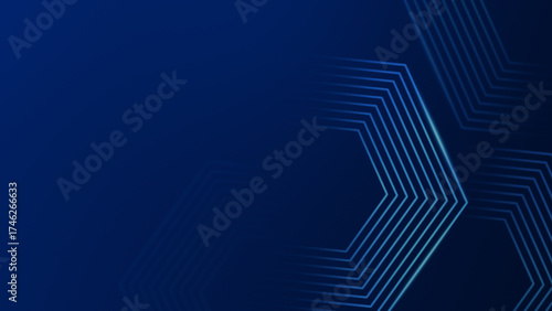 Few big fading hexagons made of light blue lines on blue background. Technology, connection and data concept. High resolution full frame abstract and modern background with copy space.