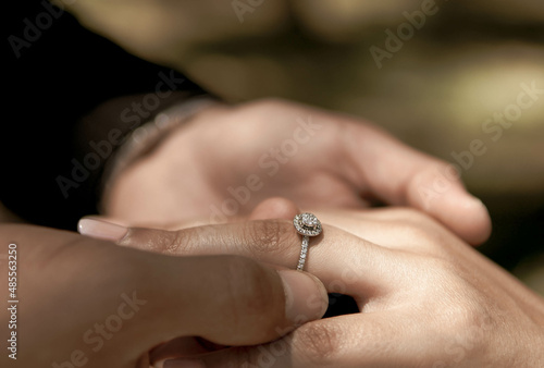 Fiancé qui donne la bague de mariage à la mariée pendant mariage