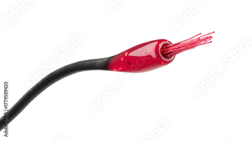 Fiber optic cable with red protective coating, exposed internal glass fibers, isolated on transparency background, used for high speed data transmission and modern telecommunication technology
