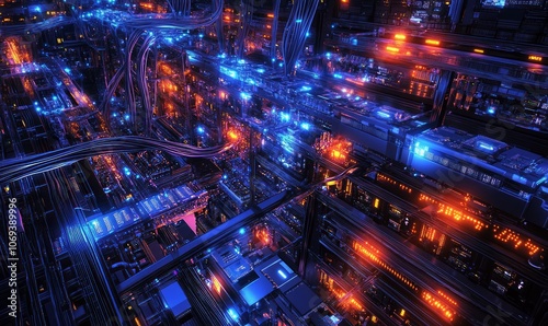 Fiber optic cables, glowing data streams, intricate network infrastructure, modern tech center