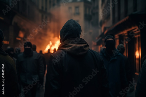 fictional looting or demonstration, robbery or theft, masked men on a street in a city commit violence with fire or a explosion and mass of people. Generative AI