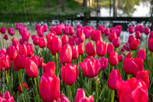 field of blooming red tulips