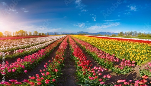 field of tulips in spring. Panoramic landscape of blooming tulips field illuminated in spring.