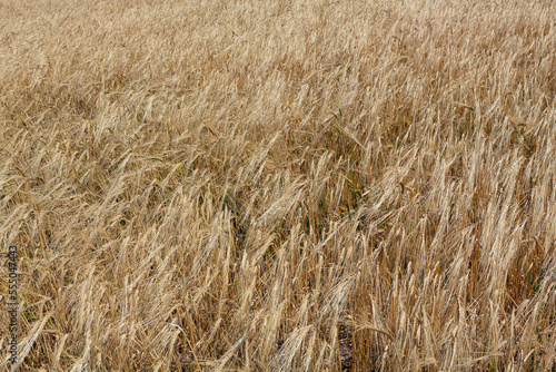 Field with ripe ears of wheat. Wheat field background.