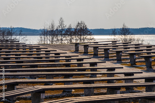 fieldwork with wooden benches